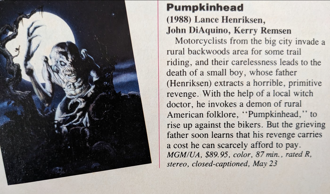 Just a little PUMPKINHEAD action for ya today. This goes back to its first video release in the spring of 1989. Ah, dig those crazy VHS prices–$89.95, damn!