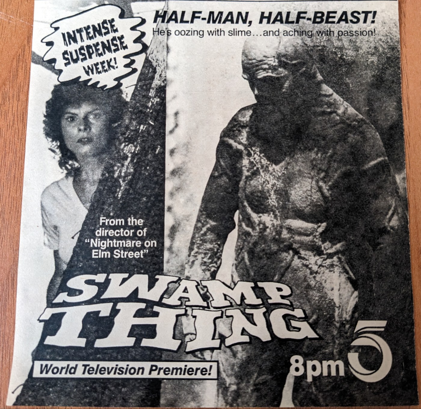 Okay, this ad (circa 1986) from Los Angeles independent station, KTLA, trumpets this showing of Wes Craven’s SWAMP THING as a ‘world television premiere’. I don’t know if I’m going to fall for that shit. I don’t mean to be a grumpy old fart here, but why did it take approximately five years for this to show up on network television? For God’s sake, PROM NIGHT (1980) was on NBC less than nine months after it was released. Nice try, KTLA. Five years, my ass.