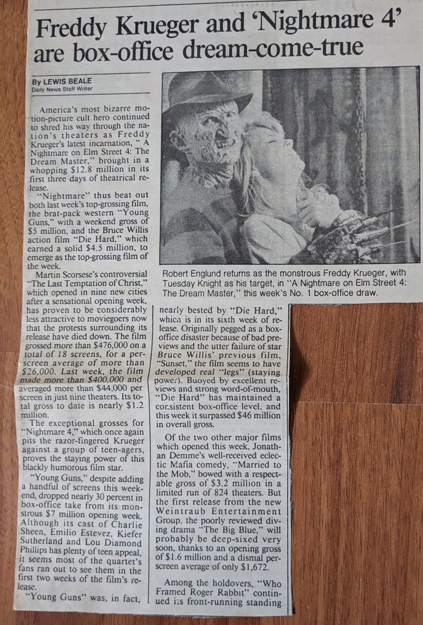 The L.A. Daily News dropped this article in late August 1988 to give the details of Freddy’s debut weekend haul of $12.8 million. That was up almost 50% from the $8.8 million he pocketed with the previous installment, A NIGHTMARE ON ELM STREET 3: DREAM WARRIORS, which opened 18 months earlier back in February 1987.