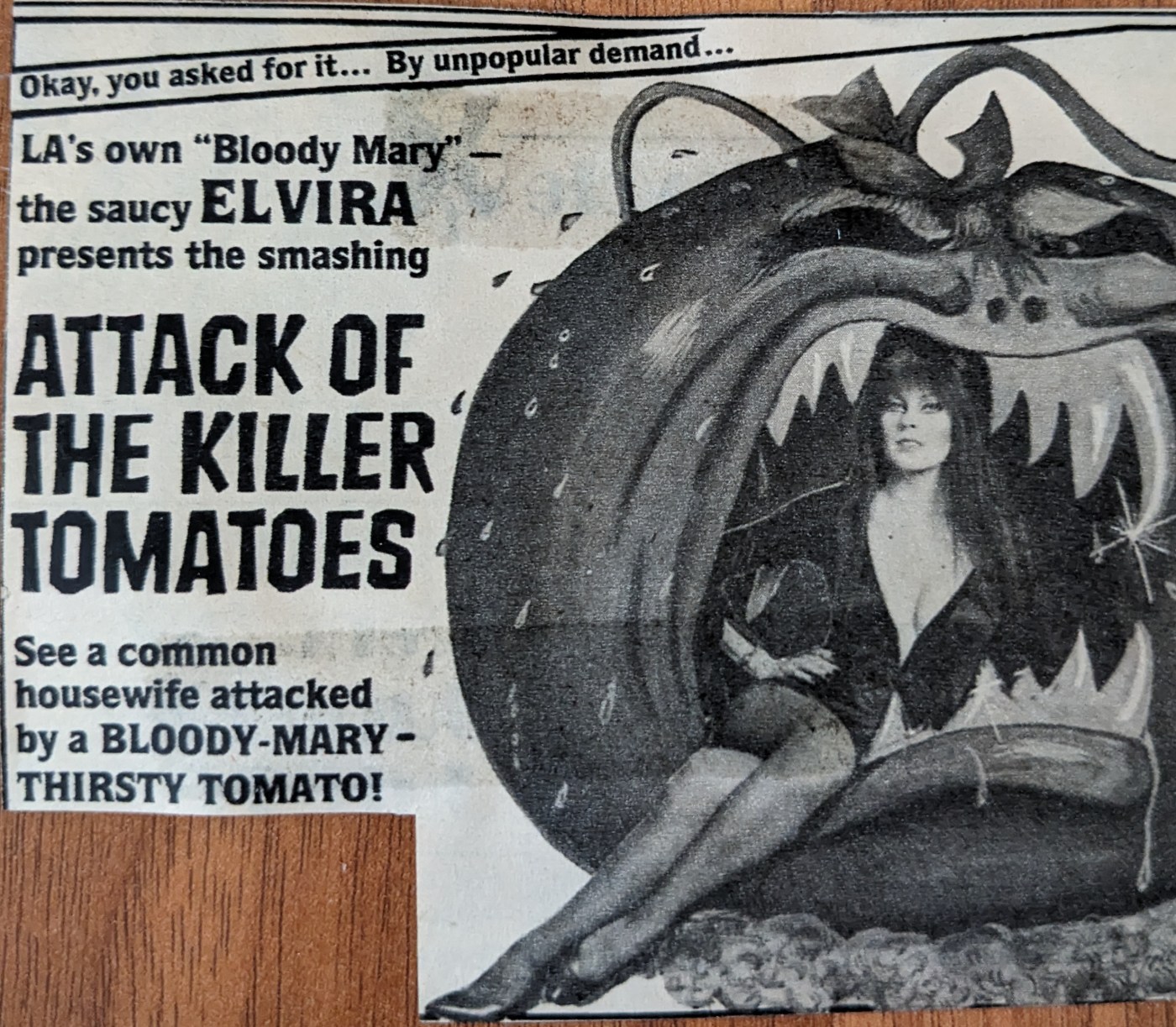 Here’s a rare one for ya–an advert from from the Los Angeles-area TV Guide from back around 1986. Back then, Elvira’s local program, “Movie Macabre” (which was broadcast on KHJ channel 9) would show the greatest AND cheesiest horror hits. This time round, it was ATTACK OF THE KILLER TOMATOES. Bust out the pizza, folks!