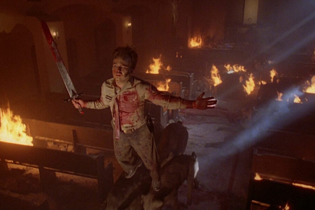 No, absolutely none of this is believable, especially in 1981, but once Stanley’s cronies start biting the dust, it doesn’t matter! Consecrated host this, sulfur that, blood whatever, blah, blah – BAM! After 75 minutes of satanic masturbation and technical hooey, we get exactly what we came for: a levitating, sword-wielding weakling about to go apeshit on his bullies. Hearts are pulled from chests, fat kids are eaten alive by pigs, and heads are split open like watermelons at a Gallagher comedy show.