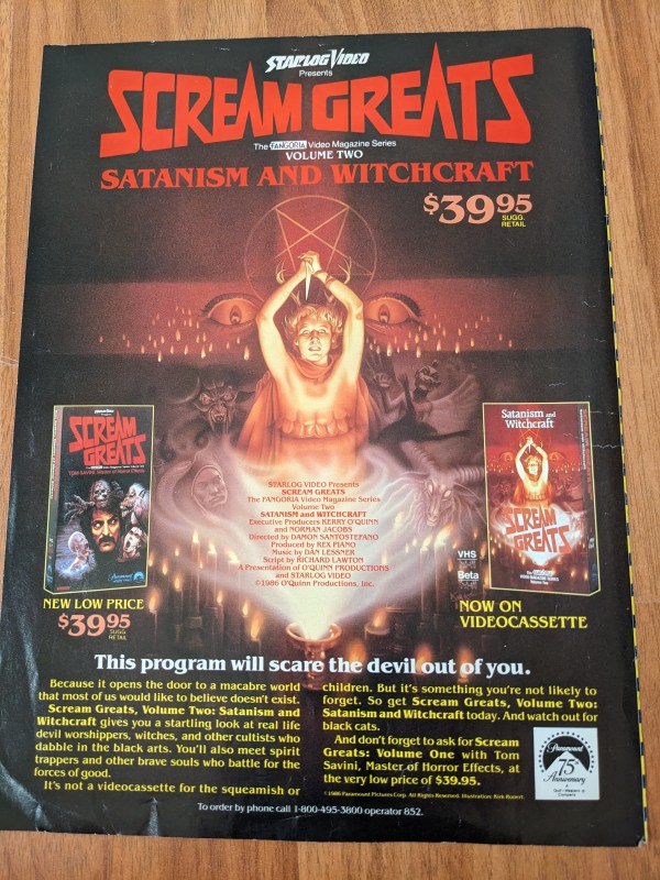 Back in the mid 1980’s, Fangoria decided to jump-start an abbreviated documentary video series that wisely began by spotlighting practical effects guru, Tom Savini. This was followed up by a second volume, “Satanism and Witchcraft”. Unfortunately, this edition would mark the end of Fango’s well-intentioned initial foray into home video. Though Savini’s volume was understandably the more popular title, volume two is much tougher to find these days. This ad is something I kept from 1986, which is when both video volumes were originally released.