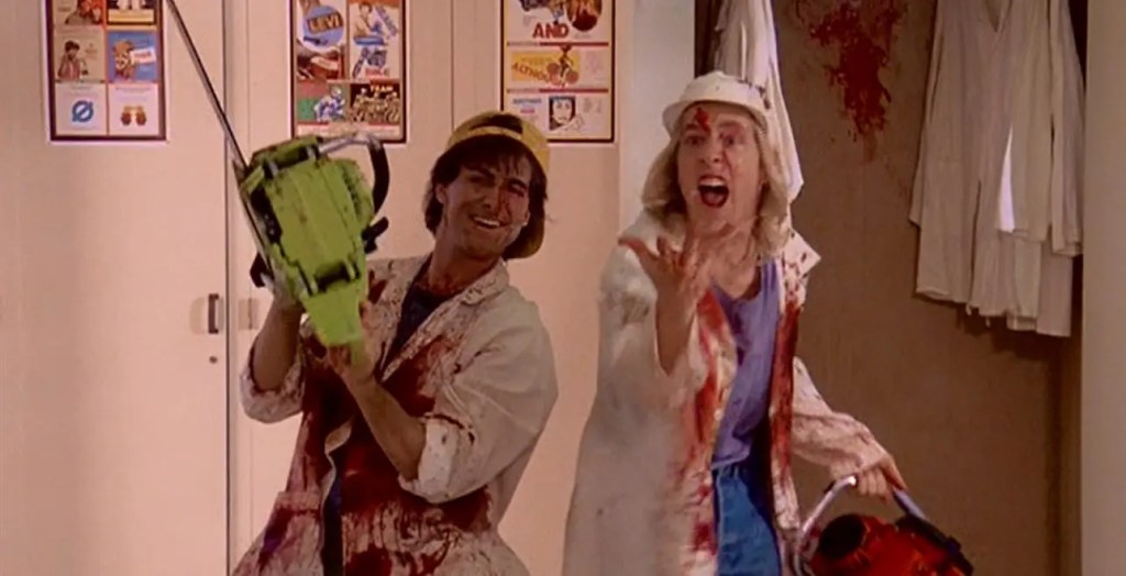 Despite Kirstie’s demure presence, the real stars of the film were Chainsaw and Dave! Played with geeky zest by Dean Cameron and Gary Riley, respectively, Chainsaw and Dave were perfect mirrors of 1980s teenage horror fans, blindly devoted to gore effects and obsessed with films like THE TEXAS CHAIN SAW MASSACRE, which they actually get to watch in class one day.