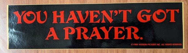Vestron Pictures decided to get comical and issue this wise-assed bumper sticker as a teaser for their release, THE UNHOLY, in the spring of 1988. It didn’t help–the film’s theatrical release didn’t even recoup its $7 million budget–but it certainly scores points for originality, that’s for sure.