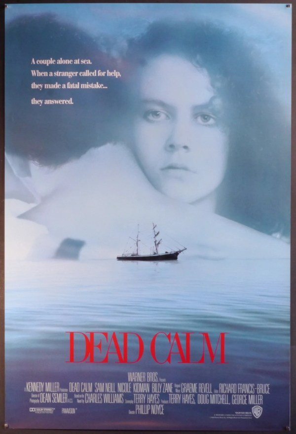 Few films of its era are able to sustain suspense better than DEAD CALM, and there are numerous people to credit for its success. Noyce and editor Richard Francis-Bruce keep both settings hopping as Graeme Revell’s score huffs and puffs in the background. Sam Neill and Nicole Kidman (in one of her first major roles) breathe humanity and tenacity alike into their roles as the Ingrams, while a pre-TITANIC Billy Zane chews the scenery admirably as Hughie. The smart, kinetic screenplay was written by Terry Hayes and adapted from the novel of the same name by Charles Williams, who took inspiration from the Bluebelle, a Florida-based ketch that was the site of multiple murder in the early 1960s.