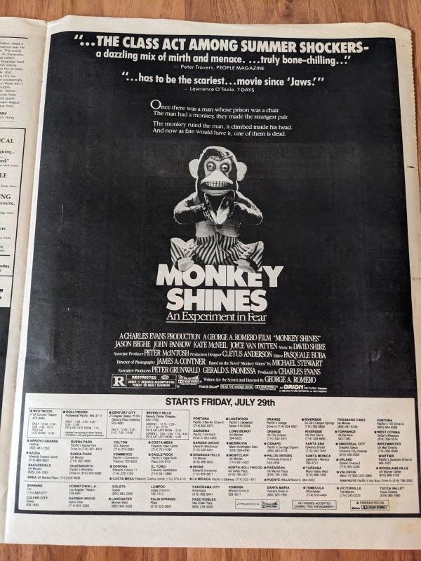 A long 36 years ago today, George A. Romero’s MONKEY SHINES debuted. Here’s a full page advert I saved from all those years ago.