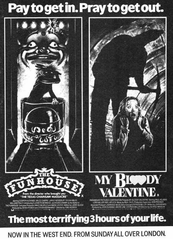 Kudos to the insane Brit who thought of putting these two slasher classics together for one shorts-soiling evening at the cinema. Now this is a night out. Though Hooper’s sleazy, suspenseful THE FUNHOUSE is the slightly better film of the two, the long-lost uncut edition of MY BLOODY VALENTINE has proved itself an absolute monster and a MUST for tonight’s Valentine’s Day viewing!