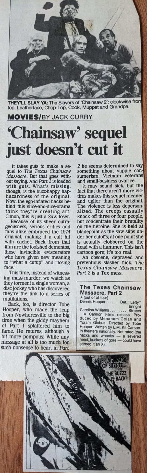 Ya know, I still don’t know why critics even bother reviewing slasher films. They all hate them and we horror fans have never given two shits about what they say. Case in point is today’s post from when the sequel to Tobe Hooper’s drive-in classic surfaced in theaters courtesy of Cannon Films.